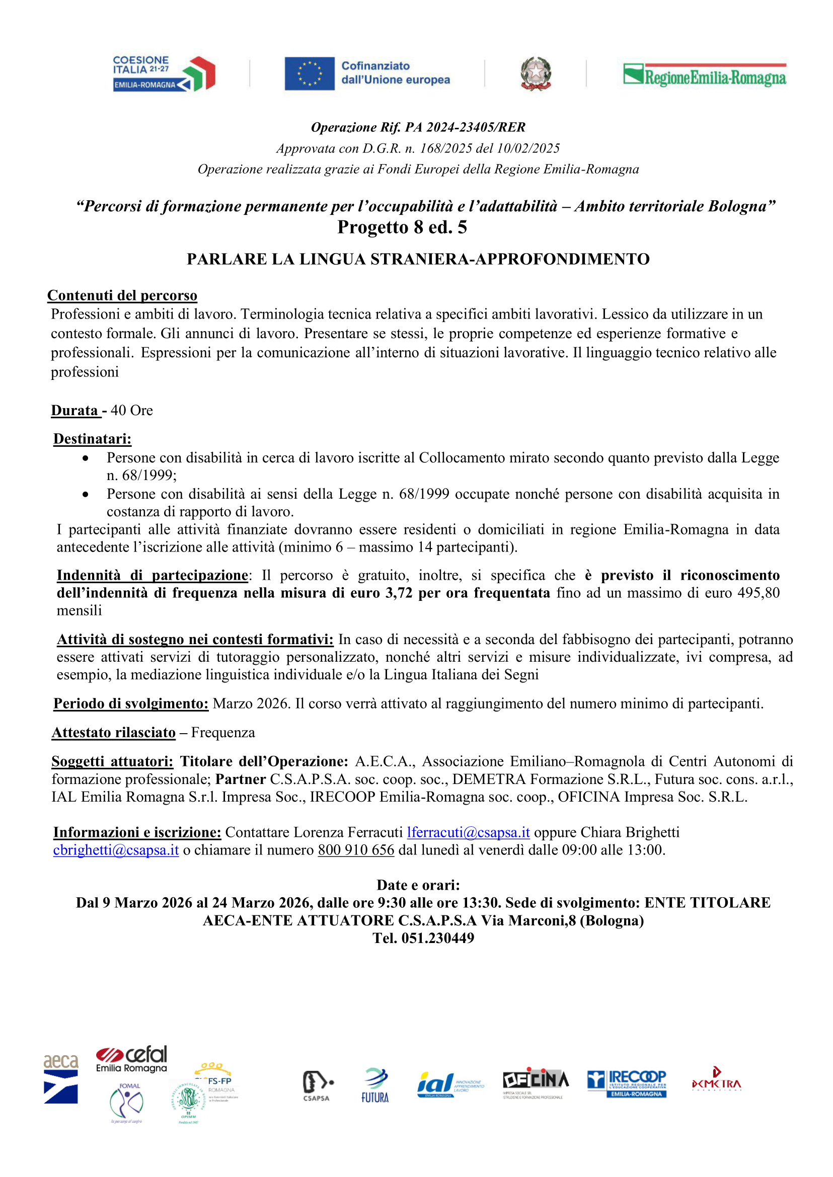 Programma dell’Operazione 2024-23405/RER “Percorsi di formazione permanente per l’occupabilità e l’adattabilità – AMBITO TERRITORIALE BOLOGNA”